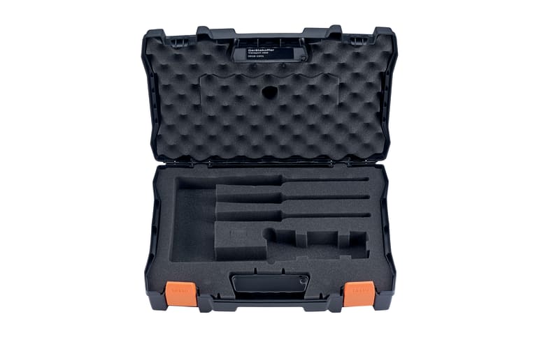 Maleta para los termómetros testo 110, 720, 922, 925 o 926; el manómetro testo 512; o los anemómetros testo 416 o 425. Troquel especial para tres sondas con vaina de medición fina y otros accesorios (p.ej. cabría una impresora portátil testo). Foam de alta densidad para evitar el movimiento de los elementos. Hueco en la tapa para documentación.