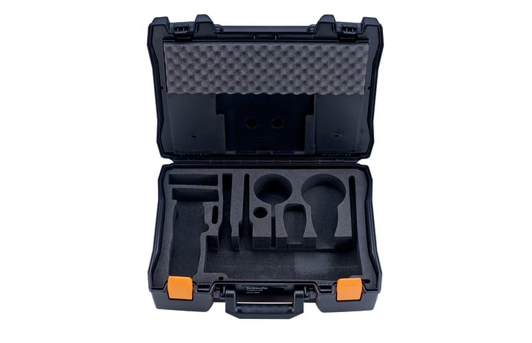 Maleta de transporte para medidor multifunción testo 435, termohigrómetro testo 635 o termómetro testo 735. Troquel especial para la colocación de sondas para medición de velocidad y/o confort. Espacio también para accesorios (p.ej. impresora portátil). Hueco en la tapa para documentación.