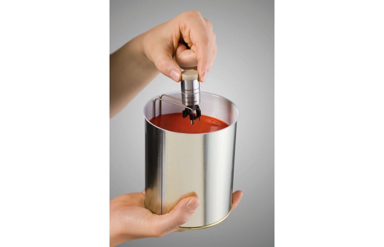 Accesorio práctico para procesos de pasteurización y esterilización: Use el trípode para latas si desea posicionar la sonda de temperatura de forma segura y exacta o si quiere mejorar la estabilidad del registrador de datos. Atornille simplemente la rosca