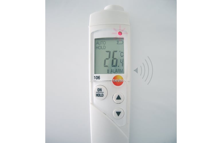 El termómetro de uso alimentario testo 106 permite medir de forma rápida y precisa la temperatura interior de los alimentos (u otros productos semisólidos). Con él, se pueden realizar hasta dos mediciones por segundo. Gracias a este tiempo de respuesta muy rápido, el testo 106 es apropiado para comprobaciones rápidas durante los controles de alimentos (p. ej., en cocinas industriales, caterings, restaurantes o cualquier negocio relacionado con la alimentación).