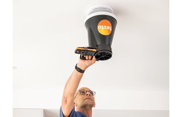 El anemómetro compacto testo 417 con sonda de molinete de 100 mm. ha sido desarrollado para facilitar y mejorar las mediciones en entradas y salidas de aire, así como en sistemas de climatización y de ventilación. El molinete de 100 mm integrado garantiza rápidamente resultados precisos. Los promedios temporales y puntuales, así como el caudal se calculan automáticamente en el instrumento y se visualizan en la pantalla. De este modo es posible regular de forma eficiente las ventilaciones de recintos. Además, la conectividad a la App testo Smart le permite configurar el anemómetro, ver los valores medidos en tiempo real en su smarphone o tablet y guardarlos en memoria. El testo 417 también está disponible en dos prácticos sets: el testo 417 set 1 incluye dos conos de medición para válvulas de disco y rejillas de ventilación. Los conos se acoplan perfectamente al molinete, lo que permite cubrir una amplia gama de tamaños y formatos de salida. El testo 417 set 2, además de los conos, también incluye un estabilizador de caudal para lograr resultados precisos en difusores de salidas de aire turbulento.
