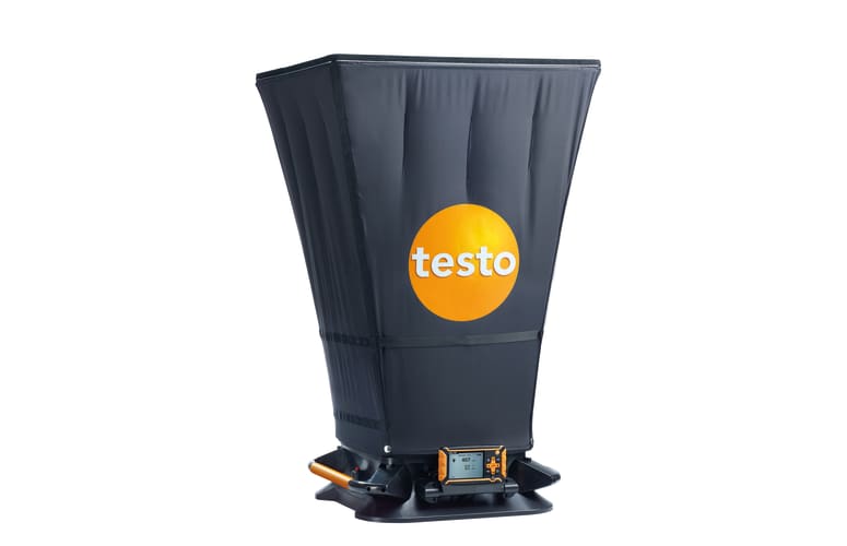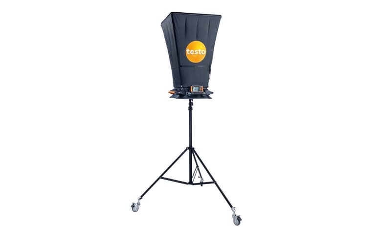 La campana mide 610 x 610 mm. Para las mediciónes en salidas de aire de otros tamaños ofrecemos campanas adicionales (consulte la pestaña «Accesorios»). Para las entradas y salidas de aire que quedan a mucha altura, también disponemos de un trípode extensible hasta 3,3 metros (véalo también en «Accesorios»).