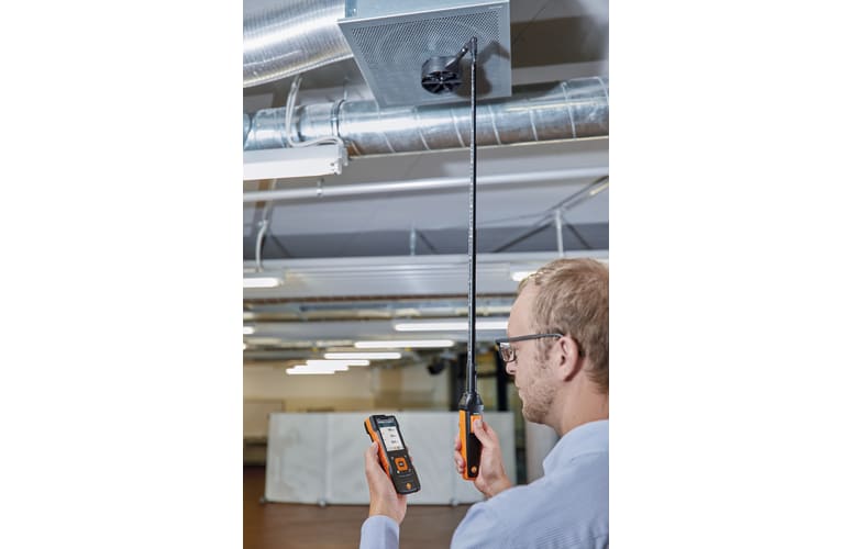 Medición sin cables molestos gracias a la empuñadura con Bluetooth de aplicación universal: con este práctico set se pueden realizar todas las mediciones relevantes en el conducto de ventilación y en rejillas. El instrumento multifuncional testo 440 dP, la sondas de molinete de 100 mm y 16 mm y la sonda de temperatura y humedad convencen por su concepto de calibración inteligente, un manejo sencillo y el máximo confort para el ajuste de sistemas de ventilación y climatización.