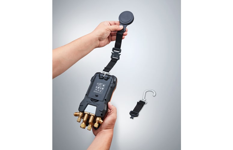 Utilice la correa magnética para sujetar de forma segura y rápida su analizador de refrigeración en superficies metálicas tales como sistemas de frío y climatización así como bombas de calor. Gracias al sencillo sistema de clic se puede intercambiar entre