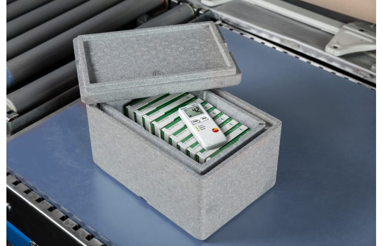 Con el testo 184 T2 se monitoriza la temperatura de las mercancías más sensibles como alimentos o fármacos durante un periodo máximo de 150 días. (Clic en la pestaña «Aplicaciones» para ver más información)
