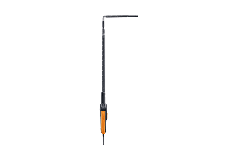 Utilice la sonda de hilo caliente para medir la velocidad, el caudal volumétrico, la temperatura y la humedad del aire con el instrumnto multifuncional adecuado Testo (se adquieren por separado).
